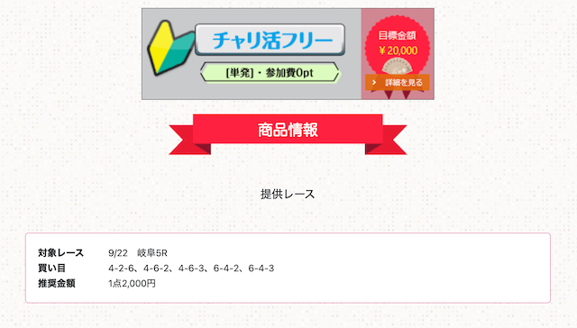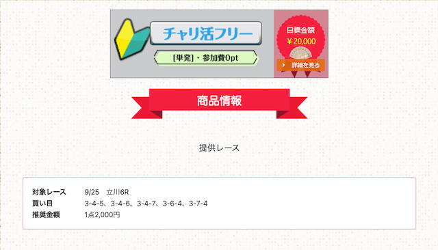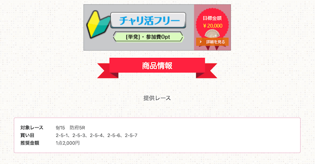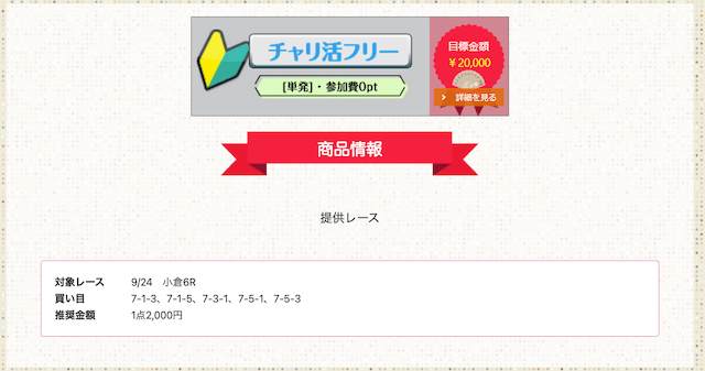 チャリ活は無料予想も有料予想もまじで半端ないです。こんなに当たって稼げるサイト初めてかもしれません。強いていうなら、重賞レースの予想をもう少し増やしてほしい!