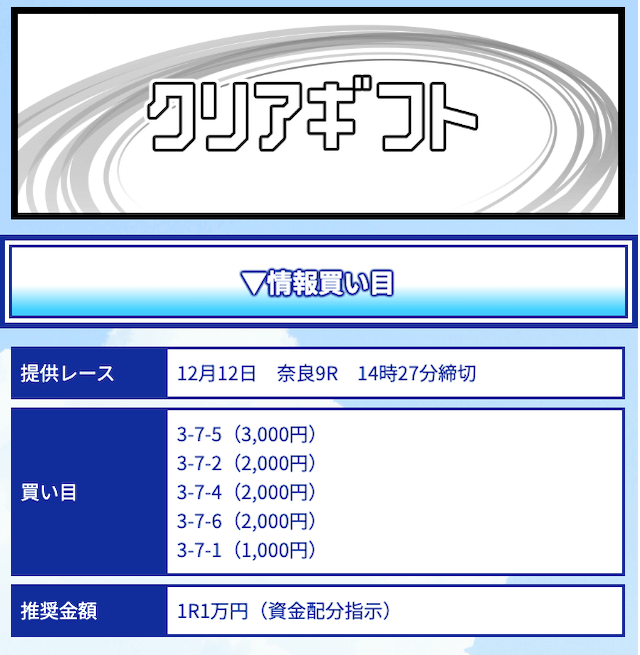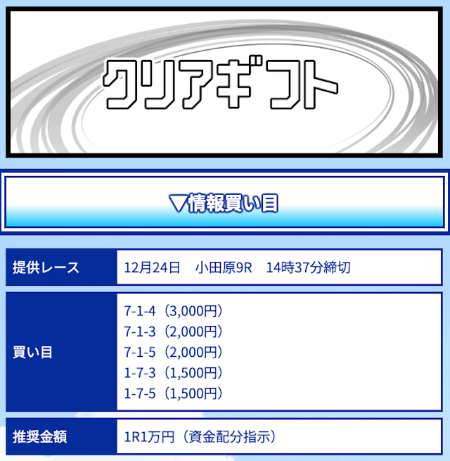 - 5.0投稿者:toto登録特典使って有料予想に実質無料で参加してみた!一番安いプランだったけど10万円もプラスでかなり満足!これは活用しない手はないね。