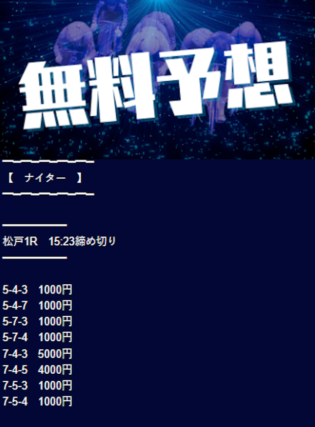 - 5.0投稿者:5555とりあえず、ミッドナイトだけで1週間使ってみた!結果は5勝でプラス8万円ほど!無料予想でこれだけ稼げるなら超満足!