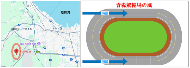 青森競輪場は、北側(2センター側)に陸奥湾があるため、北から吹く海風の影響を大きく受けます。