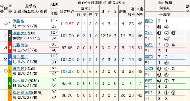 | 脇本 雄太 | S級S班 | 94期 | 福井 | 逃 | 逃げ29%:捲り71%:差し0%:マーク0% |
