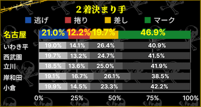 名古屋競輪場と他の競輪場の2着決まり手を比較するとマークが多いです。