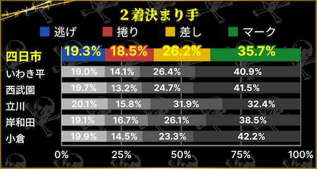 四日市競輪場と他の競輪場の2着決まり手を比較すると差し・捲りが多いです。