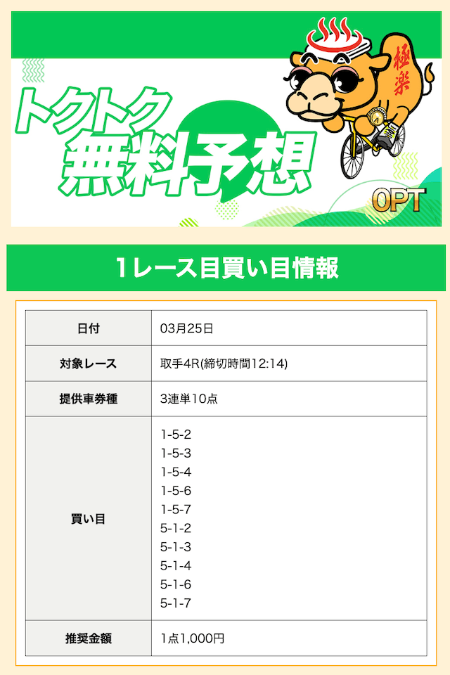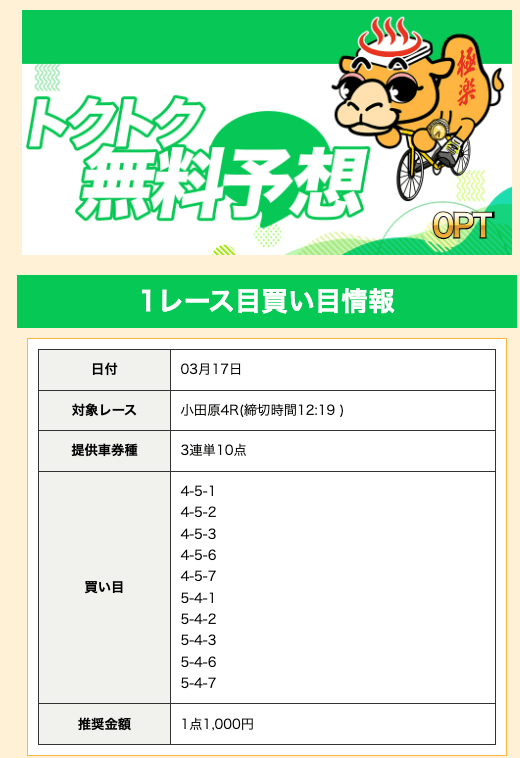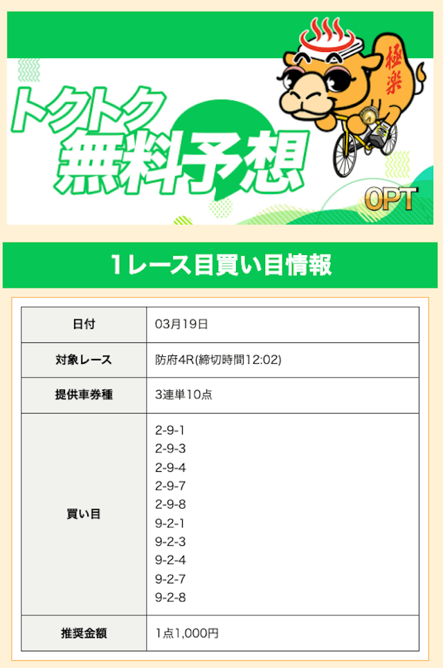 - 5.0投稿者:低劣堕落競輪戦線も参加してる6月27日僕も参加しましたよ笑めっちゃでかいあたりでびっくりした笑 でも、登録者増えて無料予想の参加者増えればオッズ下がってくよなー。今は登録者が少ないからこんなに回収率高いってことか。。。