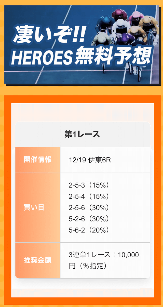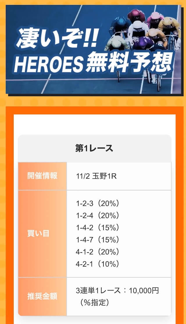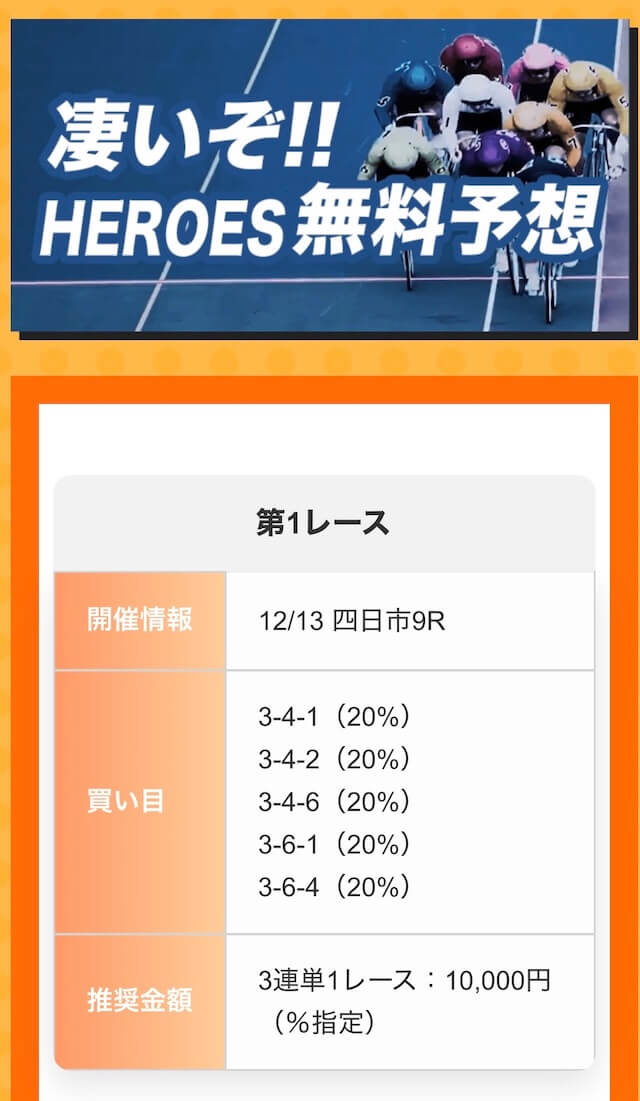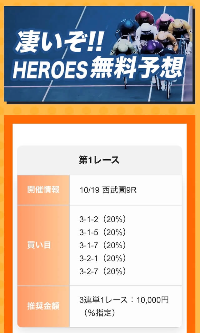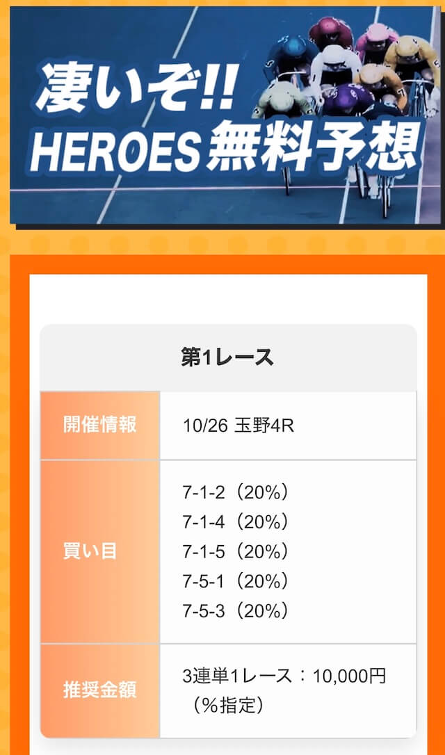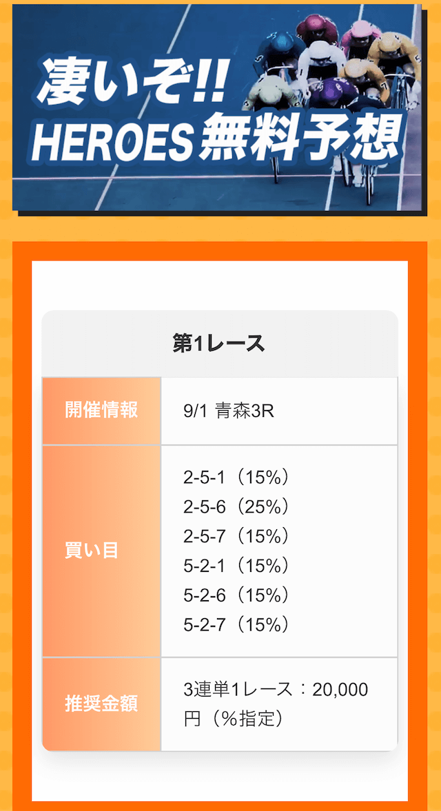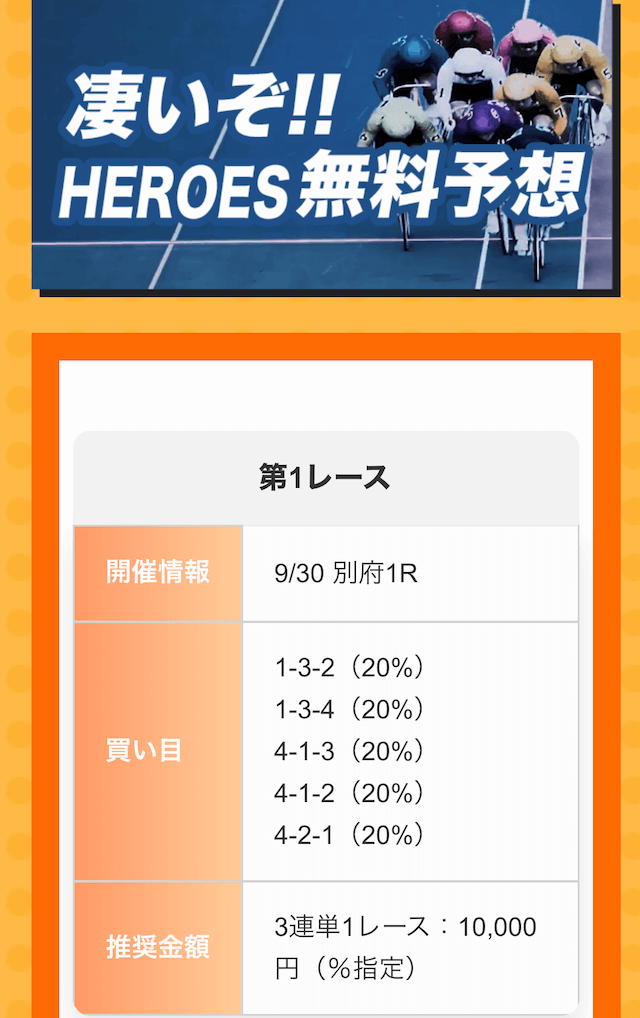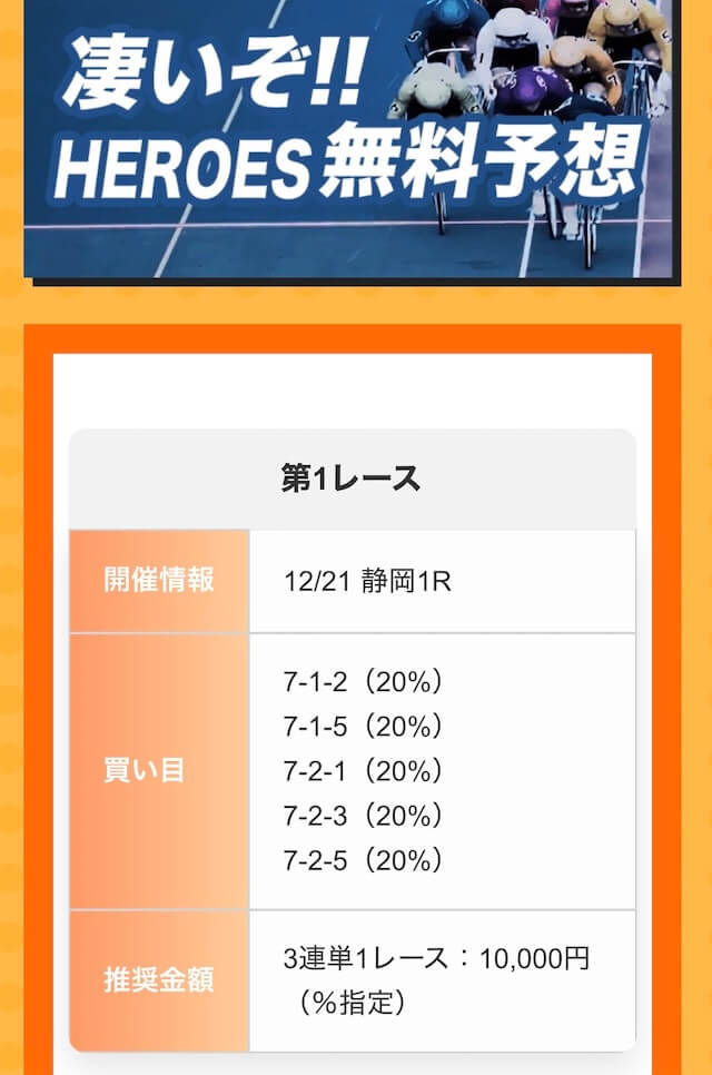 ほとんどの予想サイトは、推奨金額1万円ですが、競輪ヒーローズは2万円。