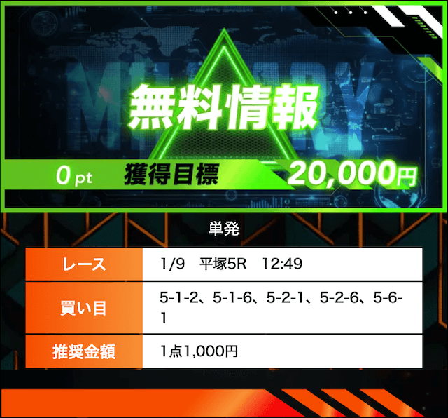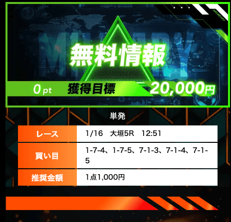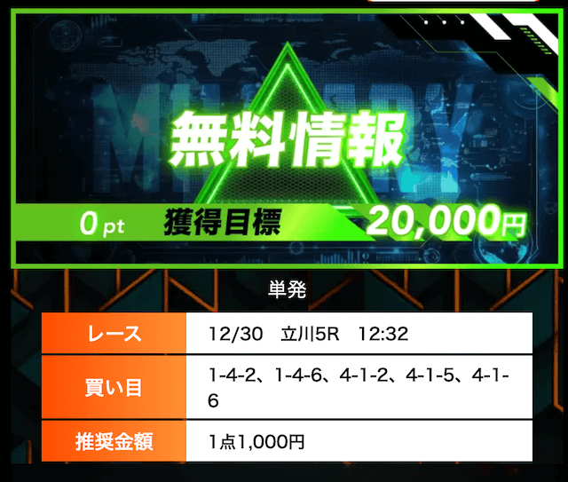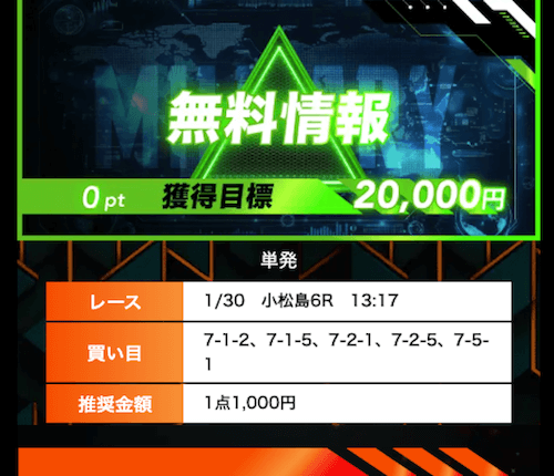- 4.0投稿者:匿名5点予想のこの精度は凄いな。普通に3連勝とかする。ただ推奨投資金5千円で高額払戻は得られないから大きく狙うなら自分で資金調整した方が良いかも。