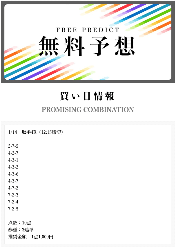 • 2026/01/14的中無料予想で10,500円獲得
