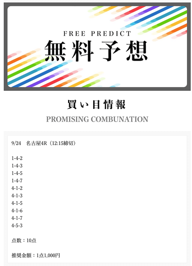 - 2024/09/24的中無料予想で22,800円獲得