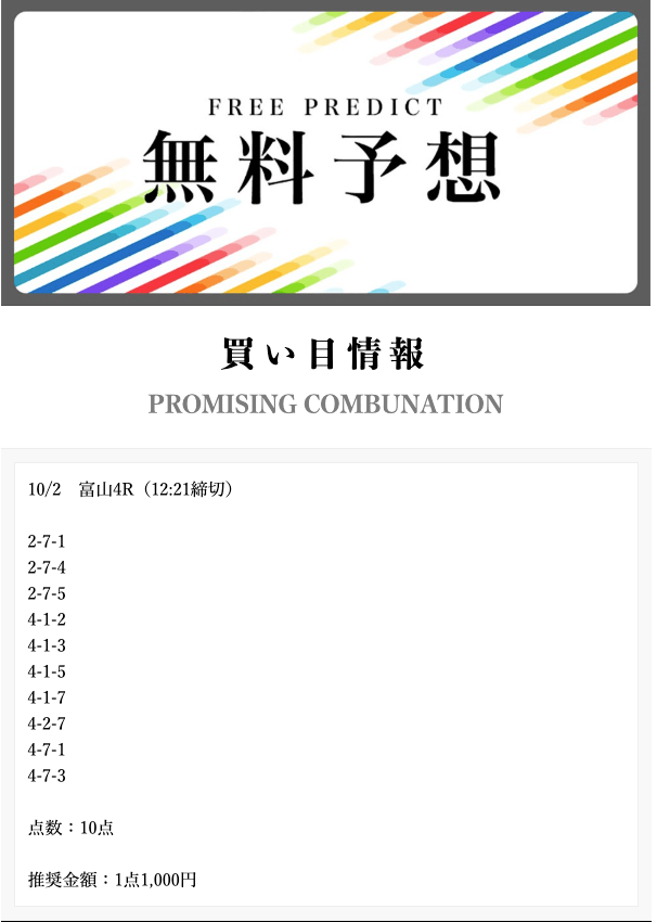 まだ無料予想1回しか使ってないけど不的中でした。