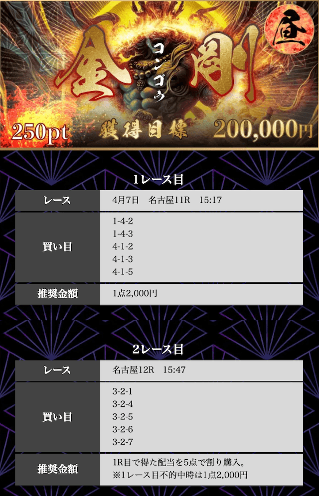 「金剛」は競輪戦線の検証で25万円の払戻を記録しており、一気に稼ぐことができるプランです。