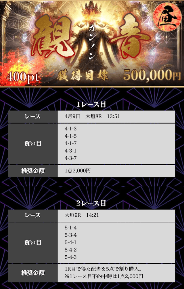 | 4/1 岸和田6R | +11,900円 | 360% | ⭕ | |