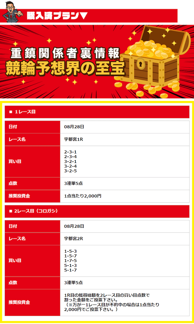 競輪友達といつも情報交換するんだけど、みんな口を揃えて言うのは宝箱さんは直近かなり調子がいいってこと。高額プランだけじゃなくて有料プランではしっかり的中してくれる。なんで急にこんなに力入ってるんだろ!とにかく今を逃すのは勿体なさすぎ。