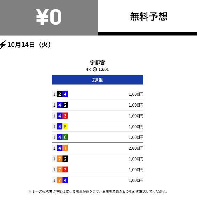 - 2025/10/11的中無料予想で14,800円獲得