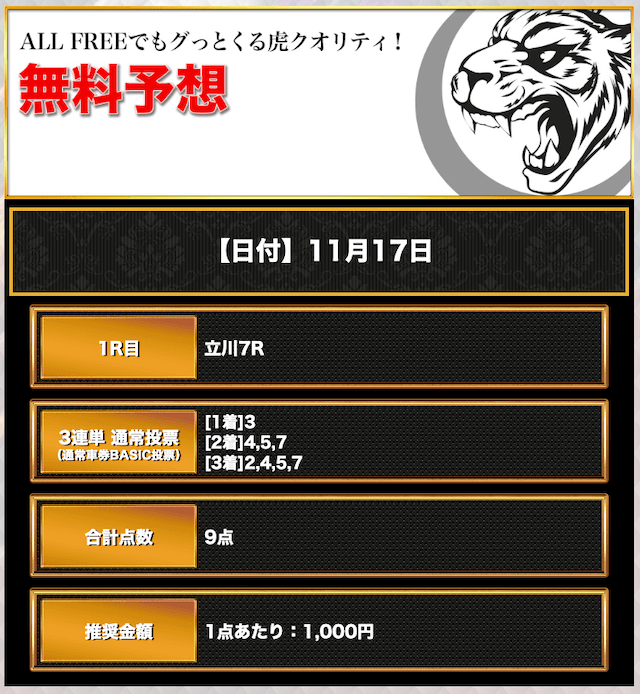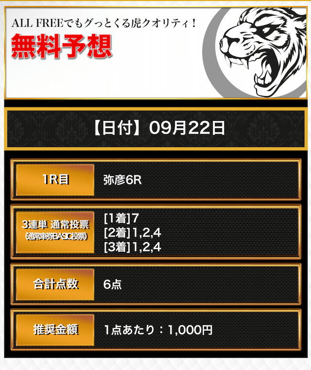 対して、競輪CLUB虎の穴の予想は6点〜10点と買い目点数がレースごとに異なるので、用意した軍資金が足らず、推奨金額通りに購入できない場合も。