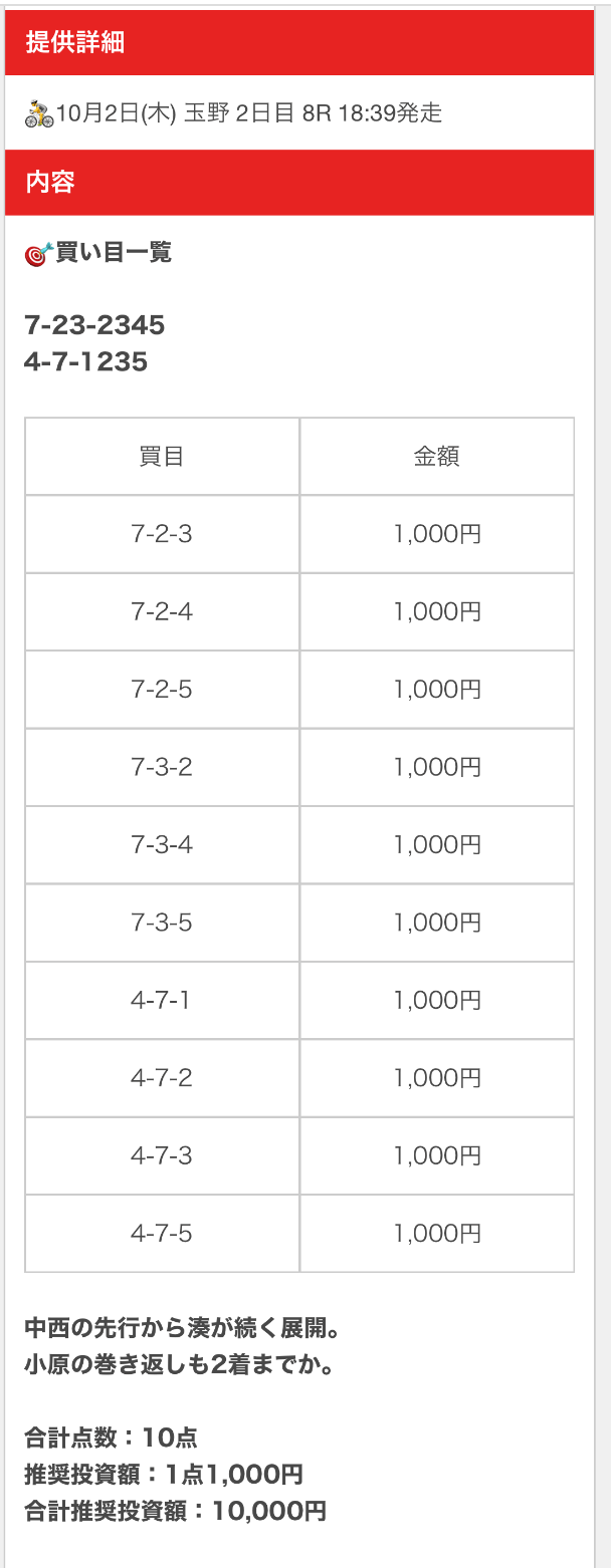 | KEIRIN INSIGHT | 5~10万円 | 10点 | 10,000円 | 不定期 | 毎日 | 1レース |