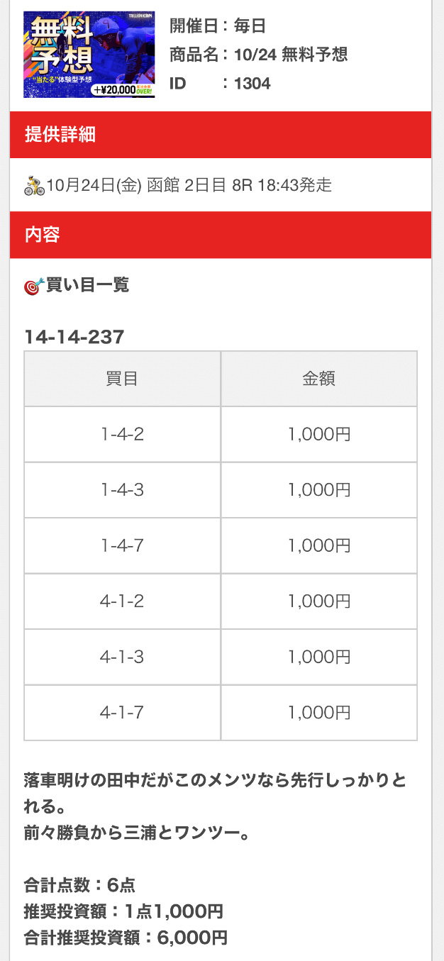 - 2025/10/24的中無料予想で14,900円獲得