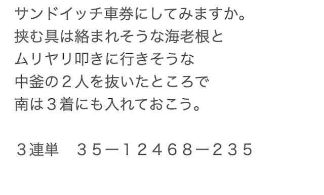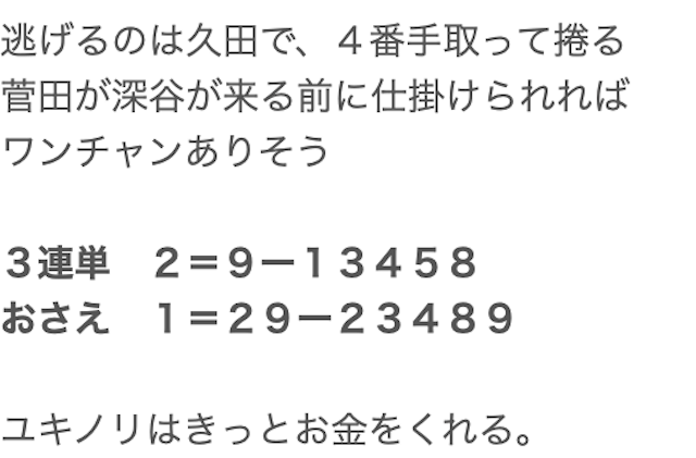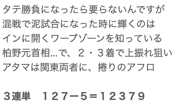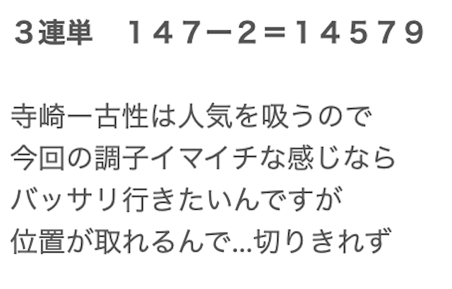公開してくれた予想にそのまま乗っかってますが、前回は5万円以上のプラスを獲得!!びっくりするほど展開も読めててさすがです。当たる頻度は少ないけどこの一発の大きさがたまらないから長い間利用させてもらってます。